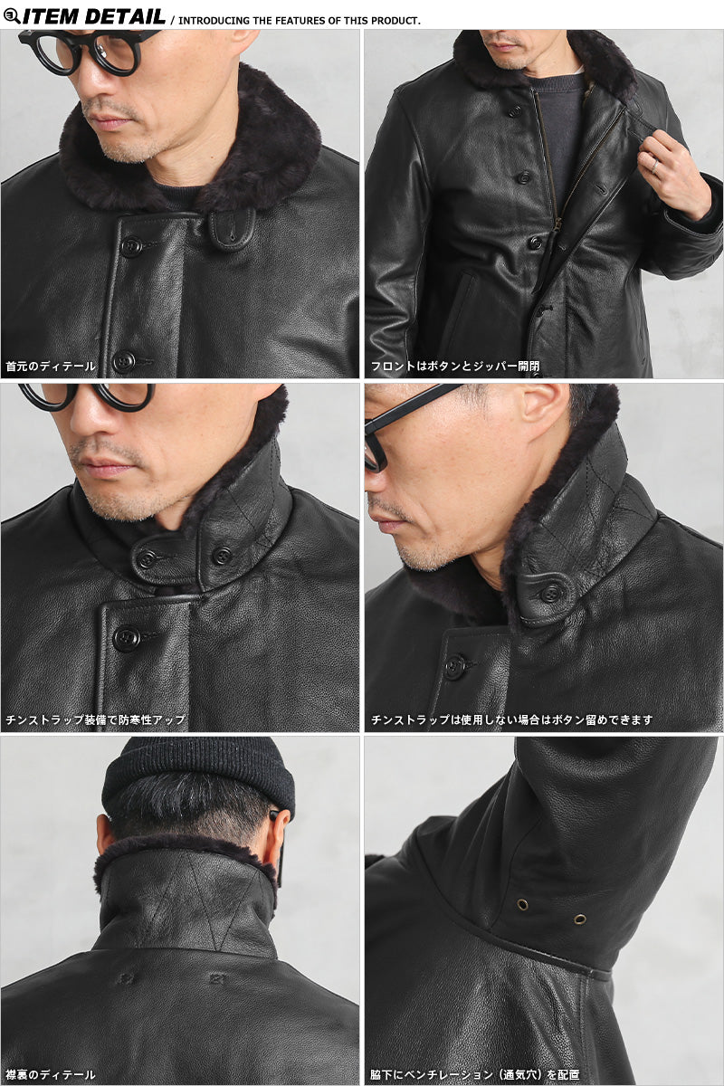 N-1デッキジャケットのディティールは実物を忠実に再現しています。衿のボアはムートン(羊毛)を使用し、ジッパーはCONMAR製で細部まで抜かりなく、ハイクラスな1着に仕上げられています。言うまでもなく防寒性は抜群です。